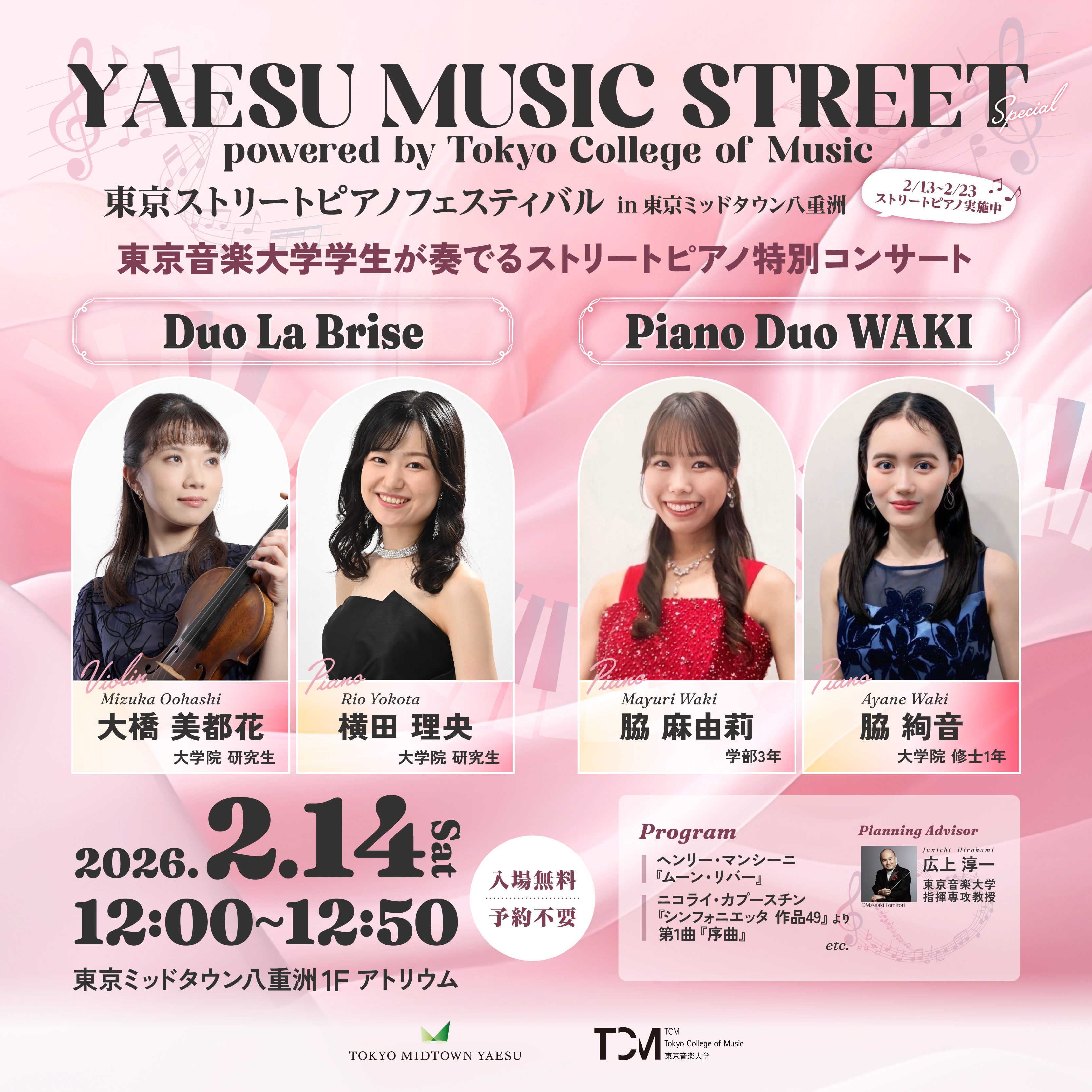 2/14(土)開催!「YAESU MUSIC STREET Special 東京ストリートピアノフェスティバル in TMT八重洲」の期間中、東京音楽大学学生によるピアノデュオ等の特別演奏会。