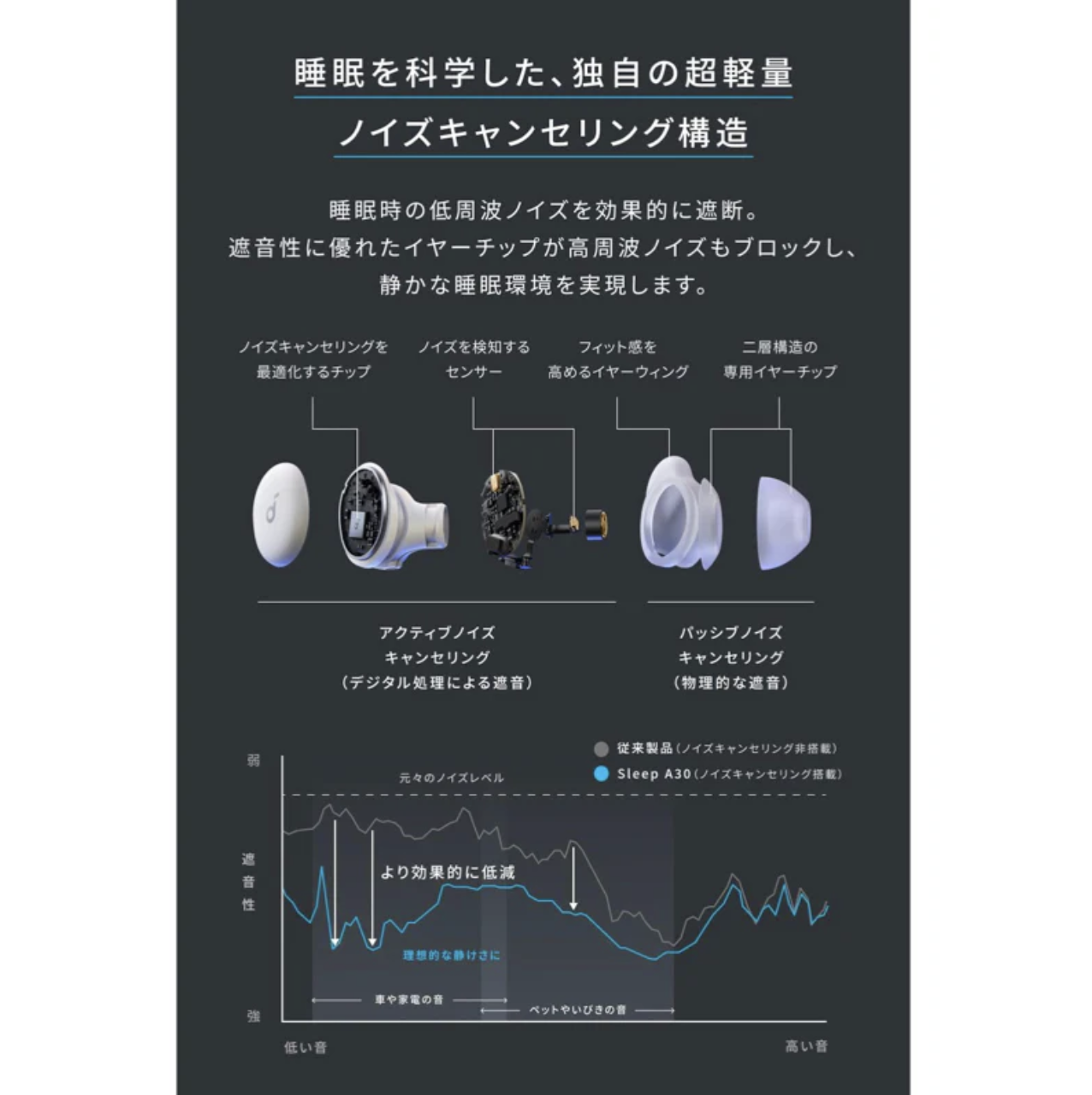 睡眠時の低周波ノイズを効果的に遮断。遮音性に優れたイヤーチップが高周波ノイズもブロックし、静かな睡眠環境を実現します。