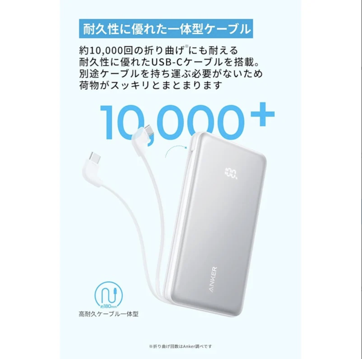 10,000回の折り曲げにも耐える高耐久ケーブルも搭載。(Anker調べ)