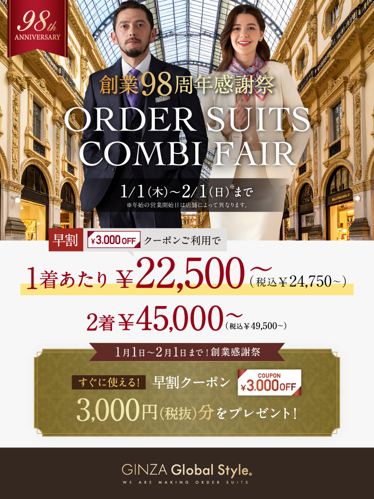 1着あたり2万円台~!オーダースーツ2着で3,000円OFF