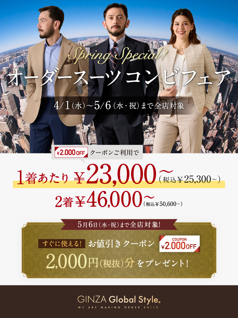 オーダースーツ2着で《2,000円OFFクーポン》プレゼント!