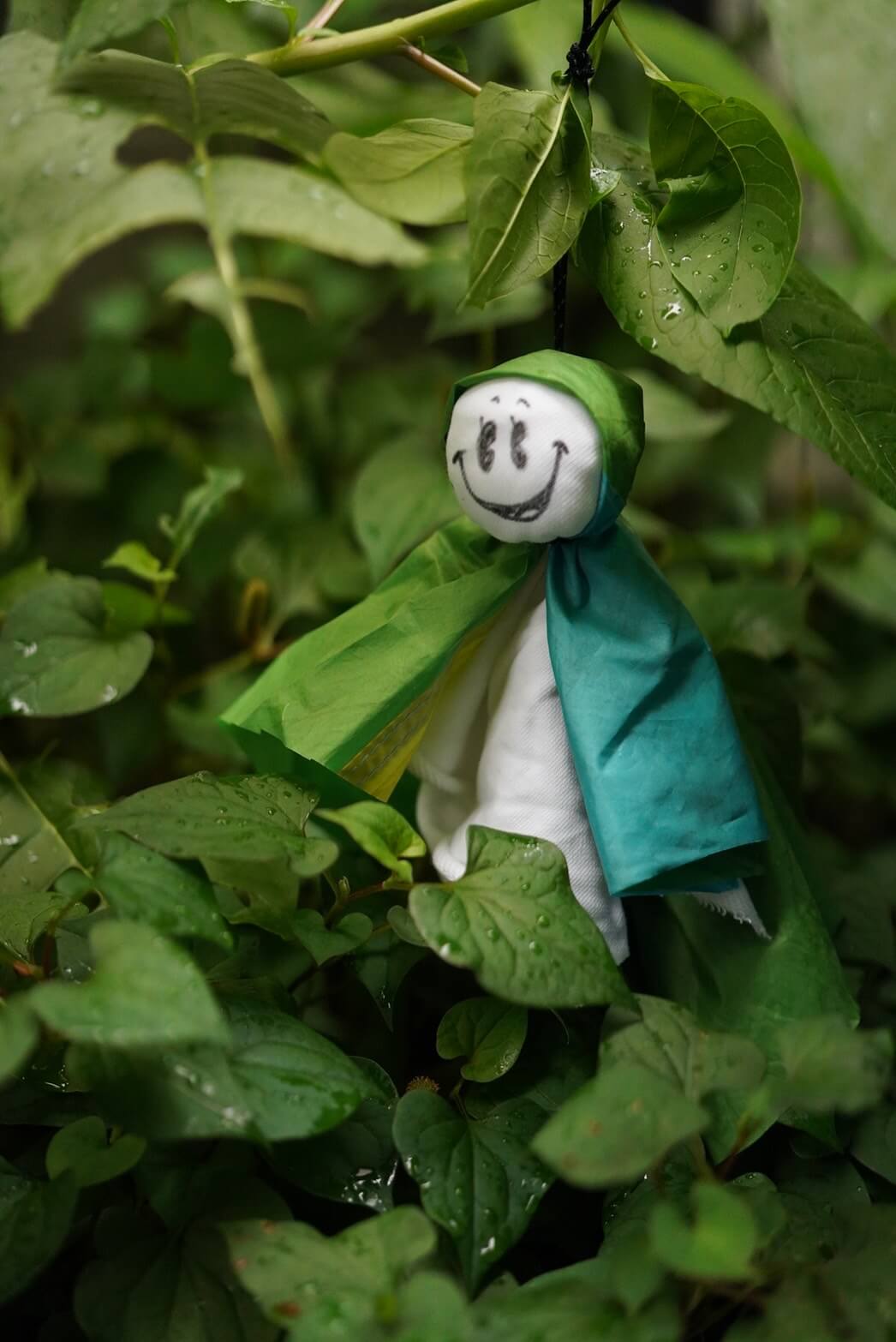 フジロックに晴天の願いを込めて、てるてる坊主の【てるてるさん】を作りませんか?ヒモとハギレとペンを使うだけなので簡単で安心!お子様でも参加できます。レインコートを着せたり、顔を書いたり、あなたや友達そっくりにしてみたり。完成したてるてるさんは、首から下げても、椅子につけても、テントに吊るしてもいいネ!明日天気になぁれ!